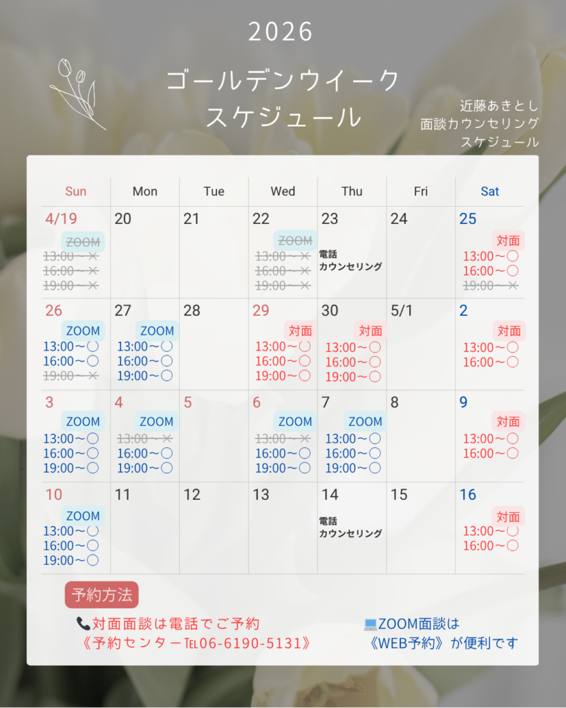 ゴールデンウイークのカウンセリングスケジュールをお知らせします。